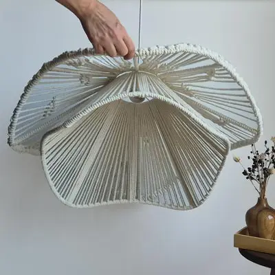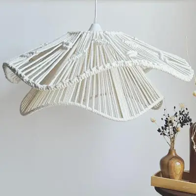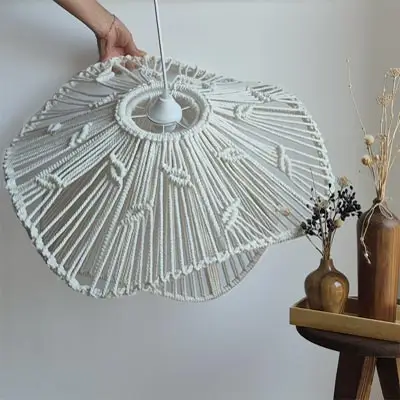 سیم و سرپیچ لوستر مکرومه دفرمه کنفی دارای رنگ سفید کوره ای است و به خوبی پوشش رنگ بر روی سرپیچ و پایه سقفی لوستر وجود دارد. این امر باعث ایجاد نمای زیبایی برای سیم و سرپیچ لوستر شده است.